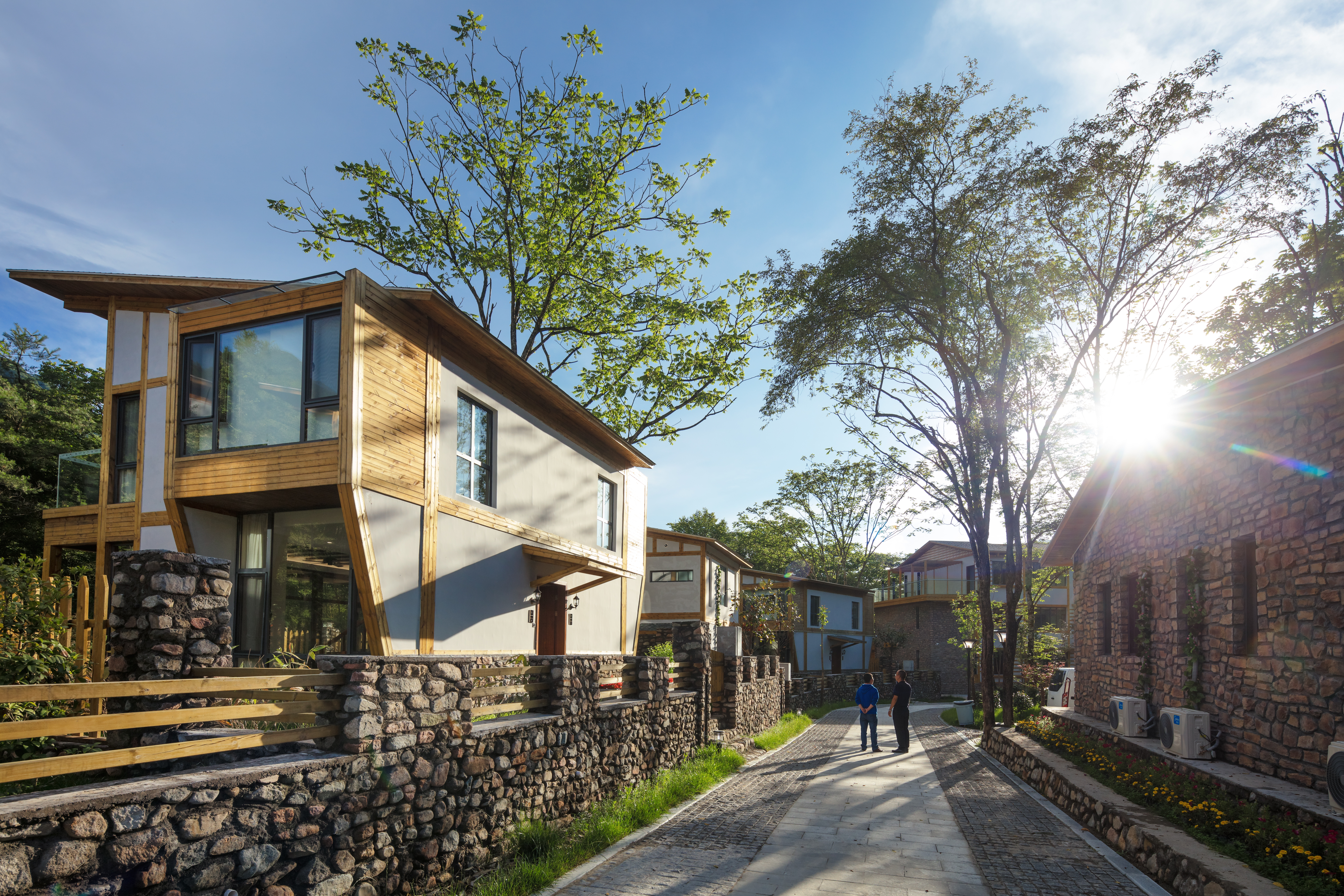 四川光霧山山語林·燕憩堂精品民宿位于國家4A級旅游景區(qū)米倉山腹心地帶,毗鄰國家級5A級旅游景區(qū)光霧山。民宿為典型的川東北傳統(tǒng)建筑,以融入森林,親近自然為建筑設(shè)計(jì)核心,借助依山傍水的森林景觀,將接待中心、餐廳和客房形成一軸兩匙三向的規(guī)劃結(jié)構(gòu),延用本地民居木質(zhì)石墻特色,采用傳統(tǒng)工藝,統(tǒng)一型態(tài)??偨ㄖ娣e 1510.40 平方米,設(shè)置 9 個院落共計(jì) 17 間房,室內(nèi)采用柔和的淺色調(diào)軟裝和充滿自然氣息的木地板,大面積玻璃門將戶外優(yōu)美的景色與室內(nèi)完美地融合,并配置星空音樂會、森林會客廳、院落火塘、萌寵樂園、一米菜園等公共休閑配套功能,讓住客可以在舒適的環(huán)境中欣賞大自然的美妙風(fēng)景,同時在移步換景中了解光霧山的動植物多樣性,沉浸式體驗(yàn)森林生活。