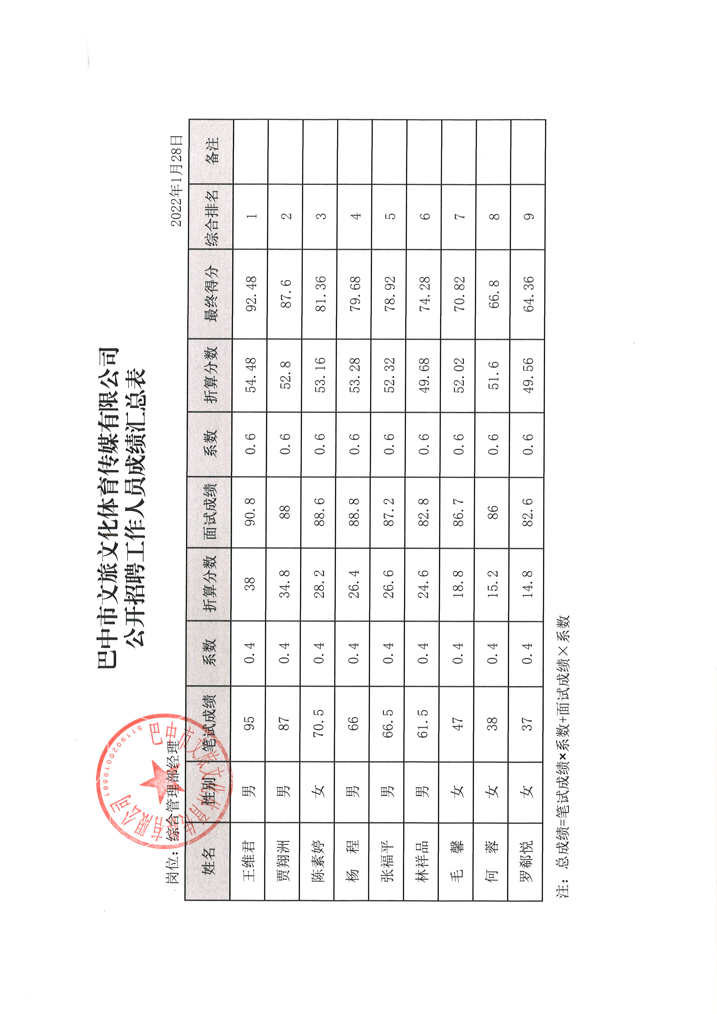 巴中市文旅文化體育傳媒有限公司公開(kāi)招聘工作人員成績(jī)匯總表