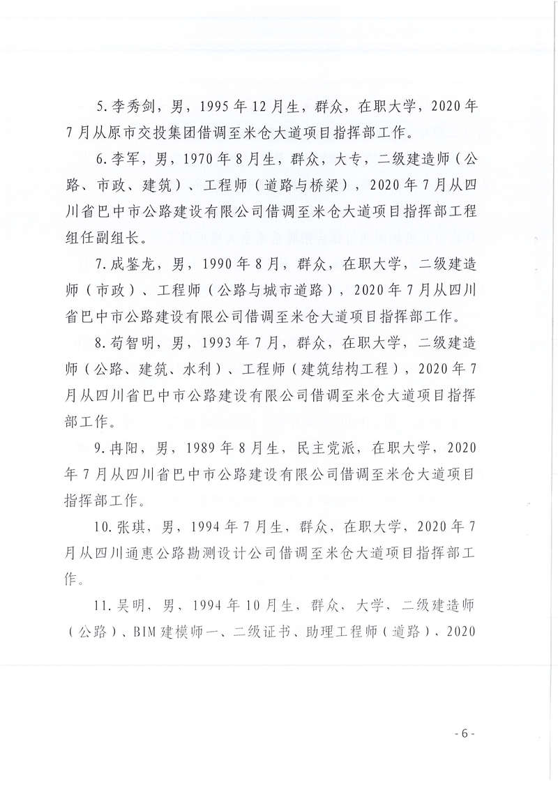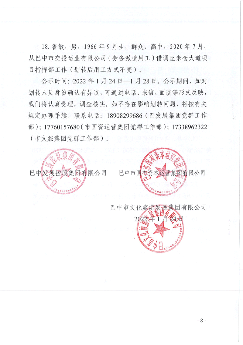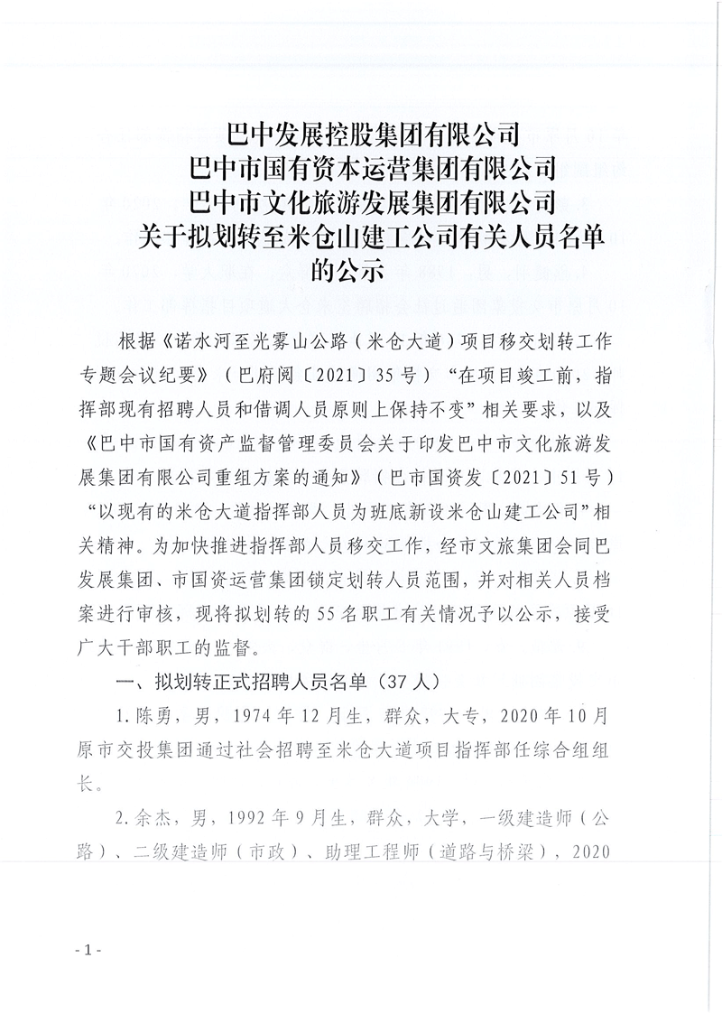 巴中發(fā)展控股集團有限公司、巴中市國有資本運營集團有限公司、巴中市文化旅游發(fā)展集團有限公司關(guān)于擬劃轉(zhuǎn)至米倉山建工公司有關(guān)人員名單的公示