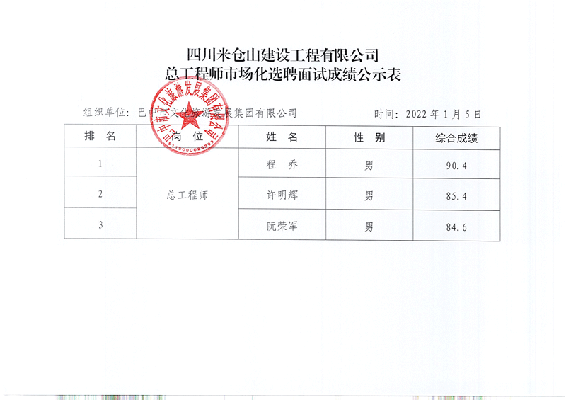 四川米倉山建設(shè)工程有限公司總工程師市場(chǎng)化選聘面試成績公示