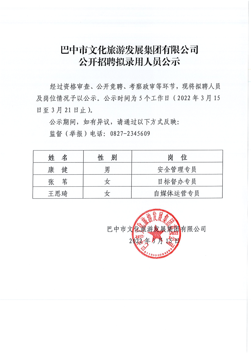 巴中市文化旅游發(fā)展集團(tuán)有限公司公開(kāi)招聘擬錄用人員公示