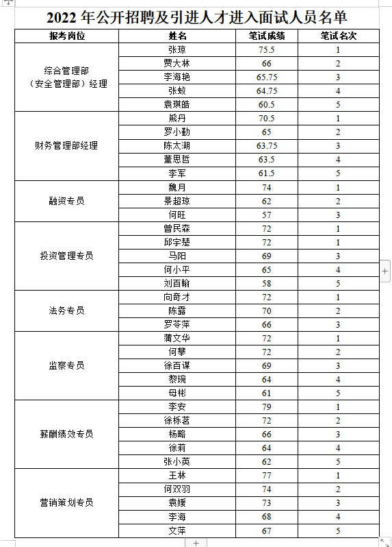 (一)面試人員名單:按照筆試成績(jī)前5名的人員(筆試考試參考人數(shù)未達(dá)到5人的,全部進(jìn)入面試)確定36名考生進(jìn)入面試。(進(jìn)入面試人員名單見附件)