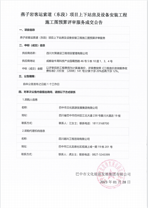 燕子巖客運索道(東段)項目上下站房及設(shè)備安裝工程施工圖預(yù)算成交單位公示
