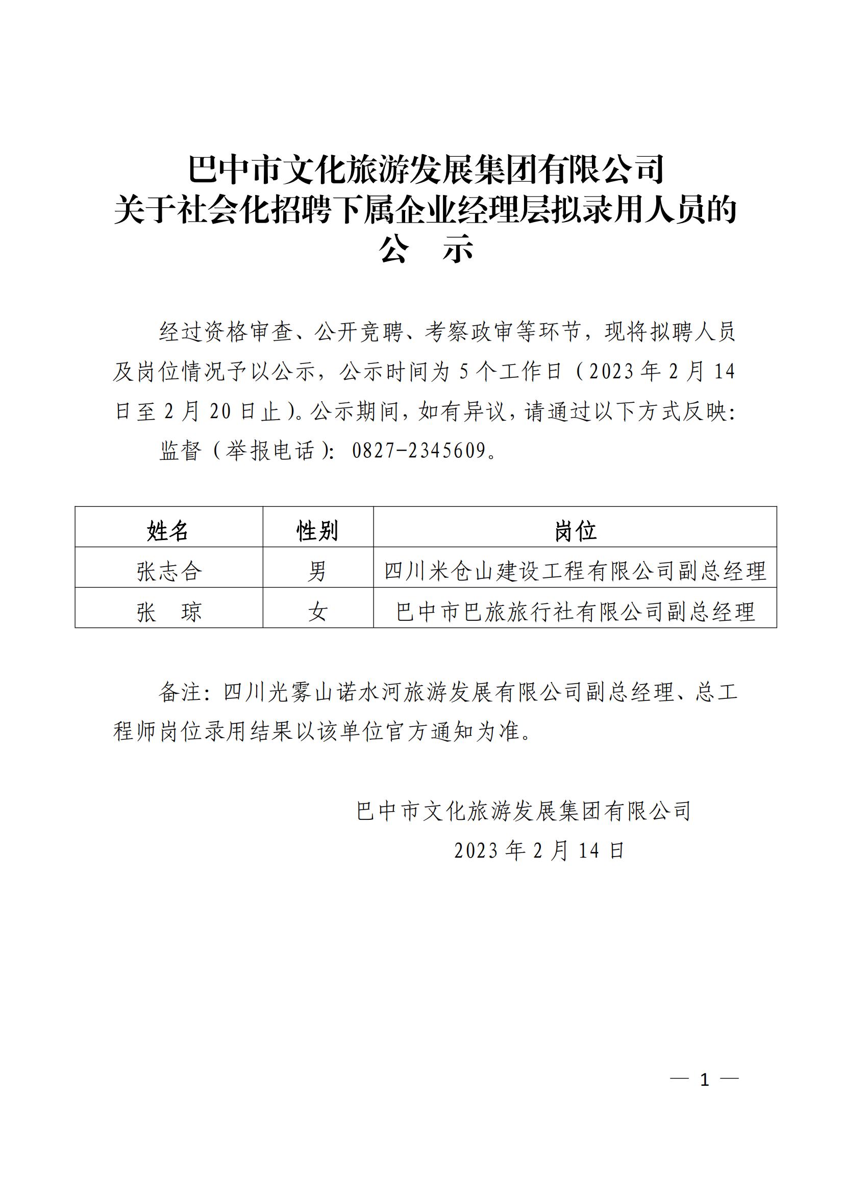 巴中市文化旅游發(fā)展集團有限公司關(guān)于社會化招聘下屬企業(yè)經(jīng)理層擬錄用人員的公示