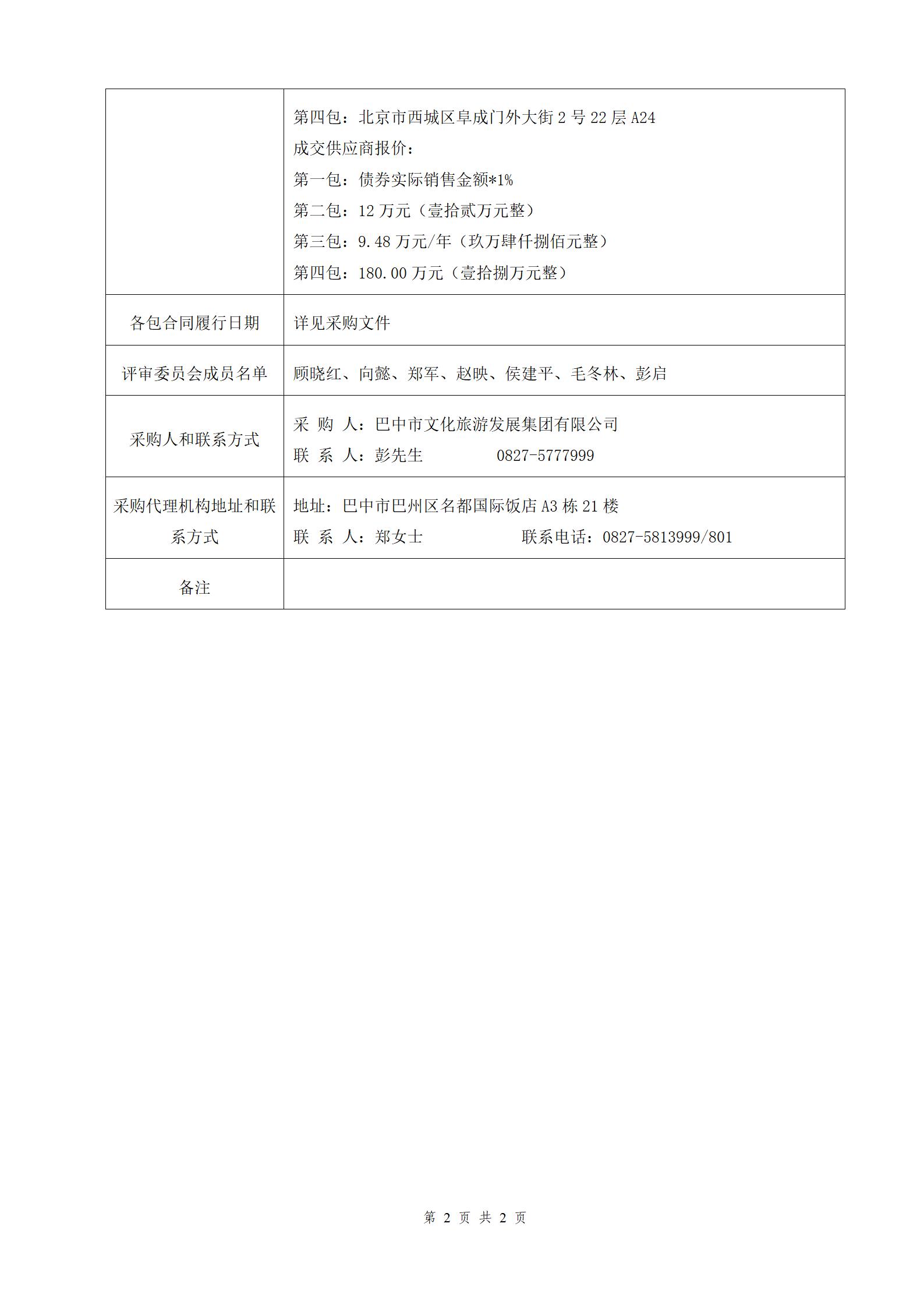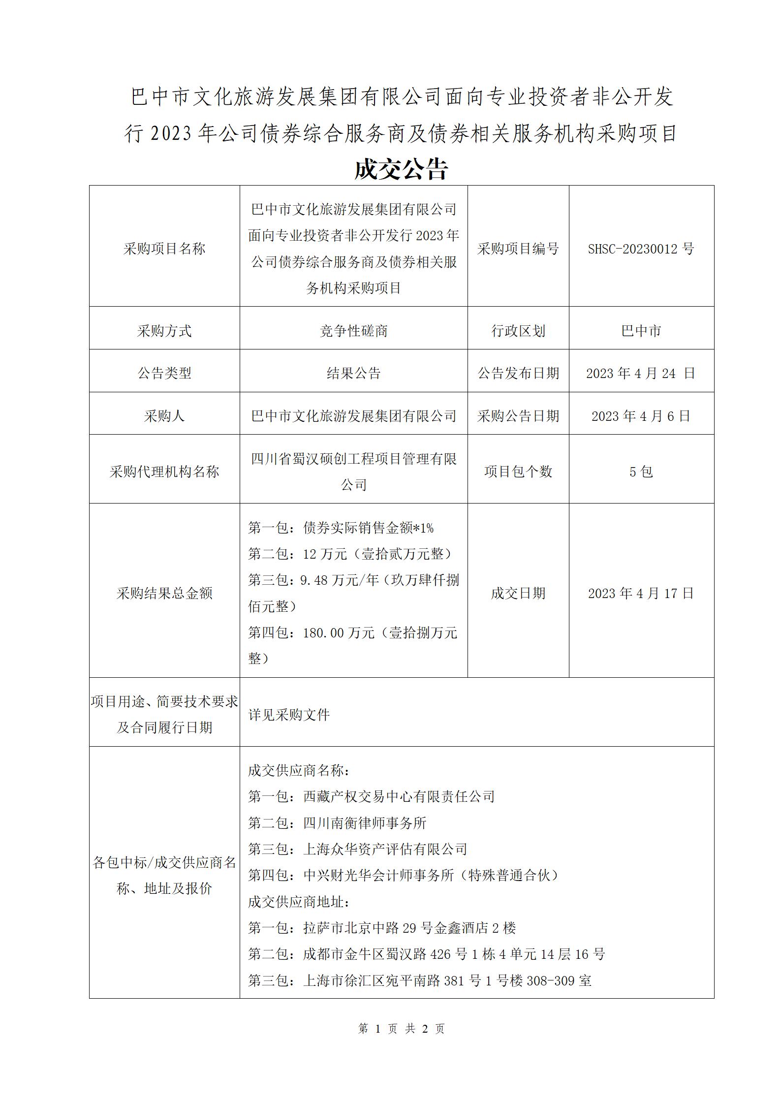 巴中市文化旅游發(fā)展集團有限公司面向專業(yè)投資者非公開發(fā) 行2023年公司債券綜合服務商及債券相關服務機構采購項目成交公告