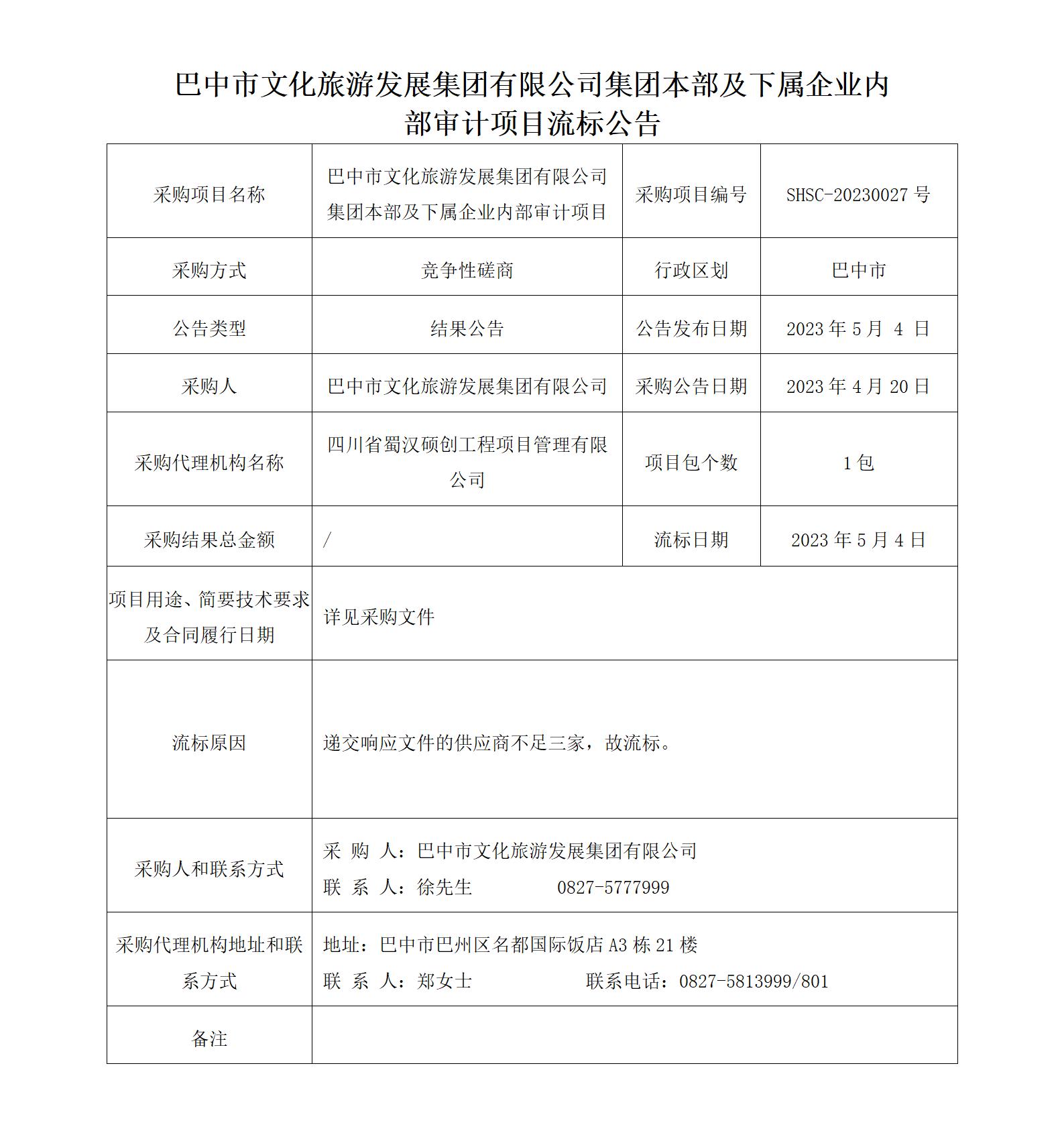 巴中市文化旅游發(fā)展集團有限公司集團本部及下屬企業(yè)內部審計項目流標公告