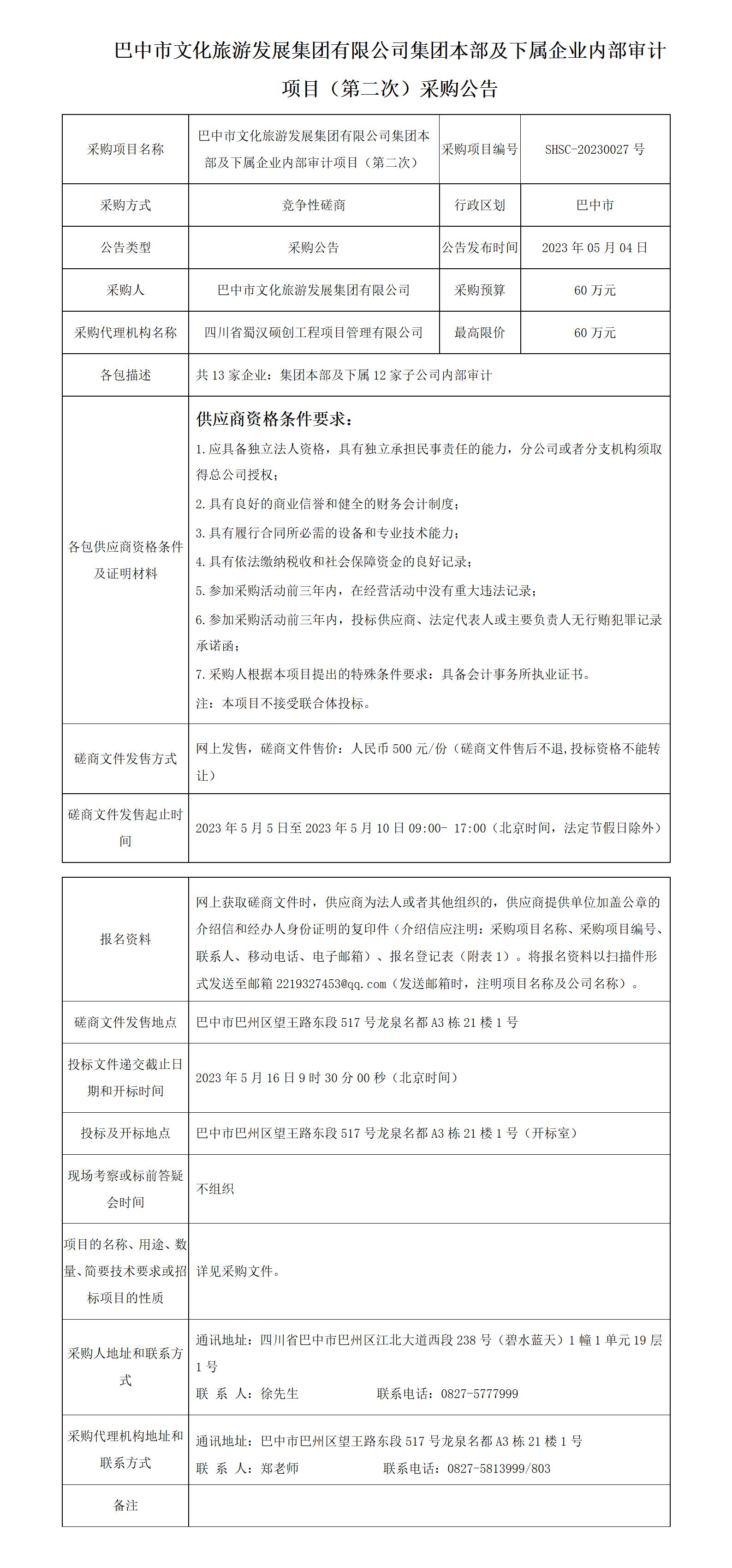 巴中市文化旅游發(fā)展集團有限公司集團本部及下屬企業(yè)內(nèi)部審計項目(第二次)采購公告