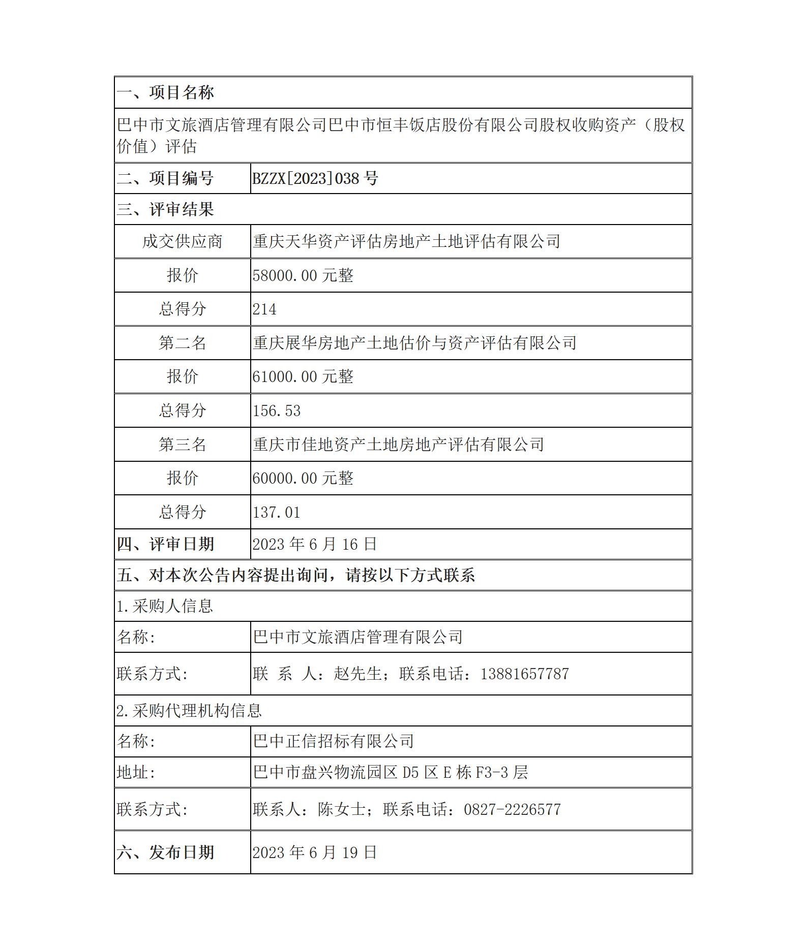 巴中市文旅酒店管理有限公司巴中市恒豐飯店股份有限公司股權(quán)收購(gòu)資產(chǎn)(股權(quán)價(jià)值)評(píng)估成交公告