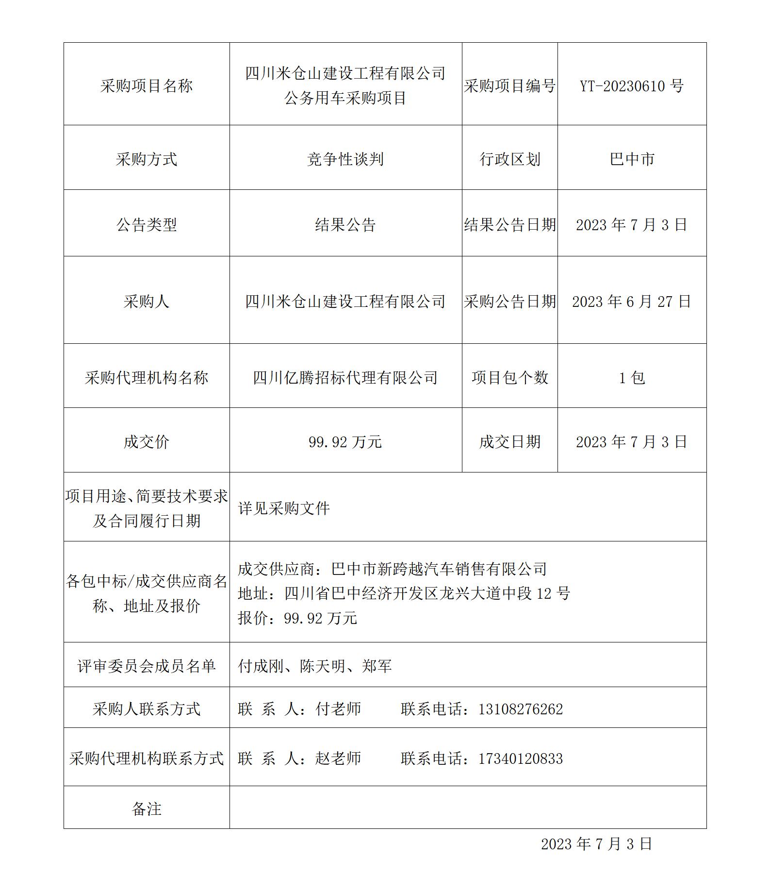 四川米倉(cāng)山建設(shè)工程有限公司公務(wù)用車采購(gòu)項(xiàng)目采購(gòu)結(jié)果公告