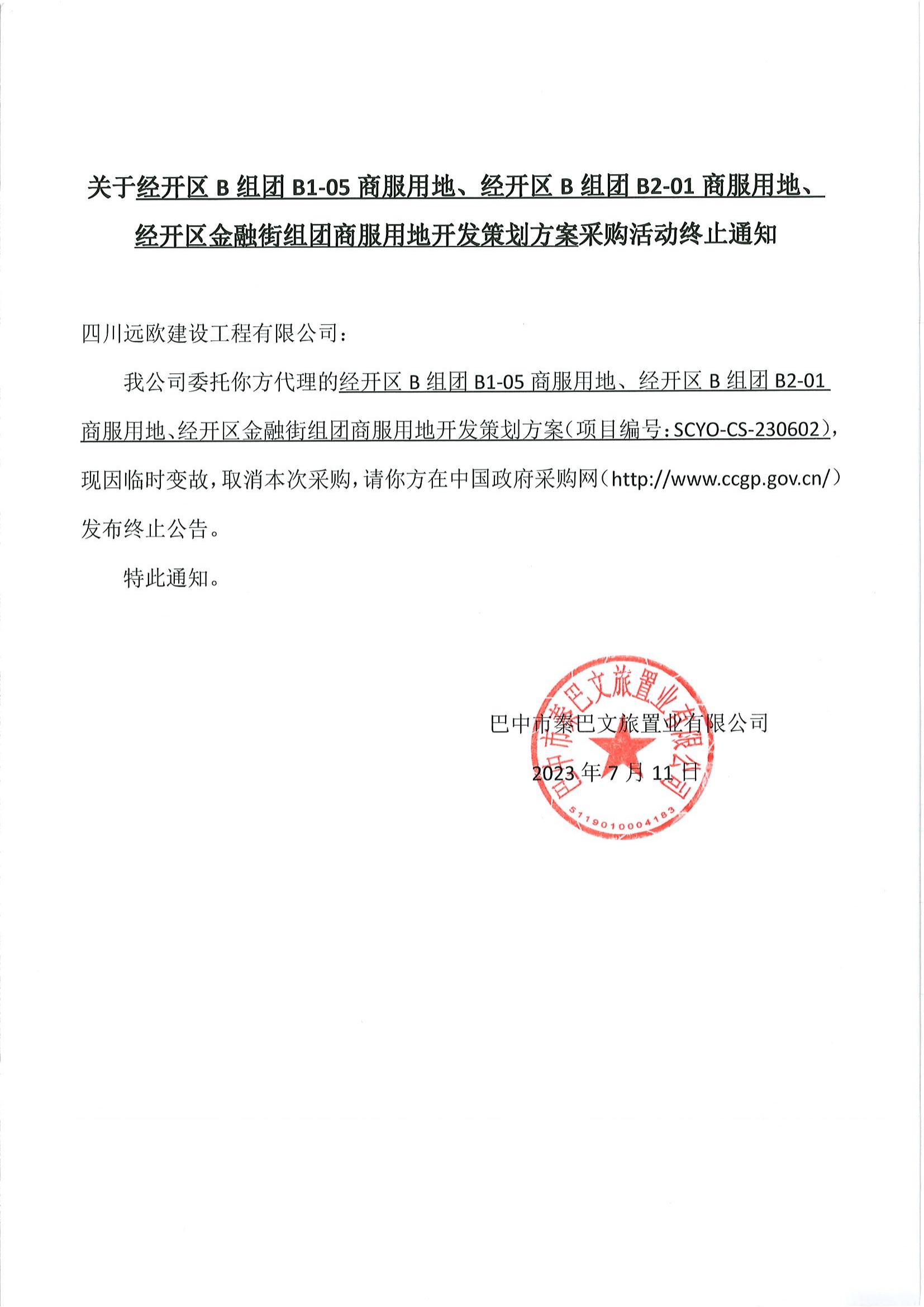關(guān)于經(jīng)開(kāi)區(qū)B組團(tuán)B1-05商服用地、經(jīng)開(kāi)區(qū)B組團(tuán)B2-01商服用地、經(jīng)開(kāi)區(qū)金融街組團(tuán)商服用地開(kāi)發(fā)策劃方案采購(gòu)活動(dòng)終止通知