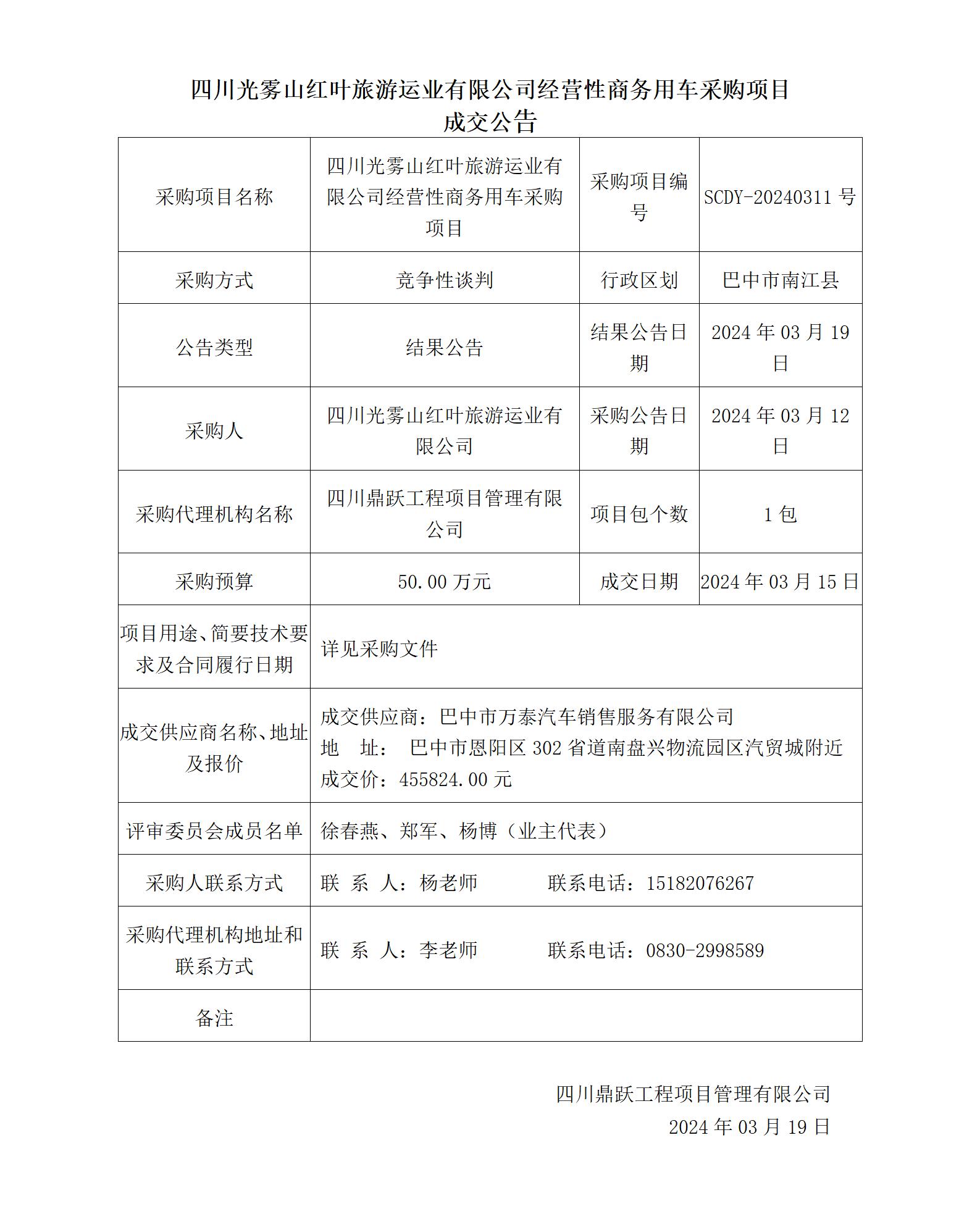 四川光霧山紅葉旅游運(yùn)業(yè)有限公司經(jīng)營(yíng)性商務(wù)用車(chē)采購(gòu)項(xiàng)目成交公告