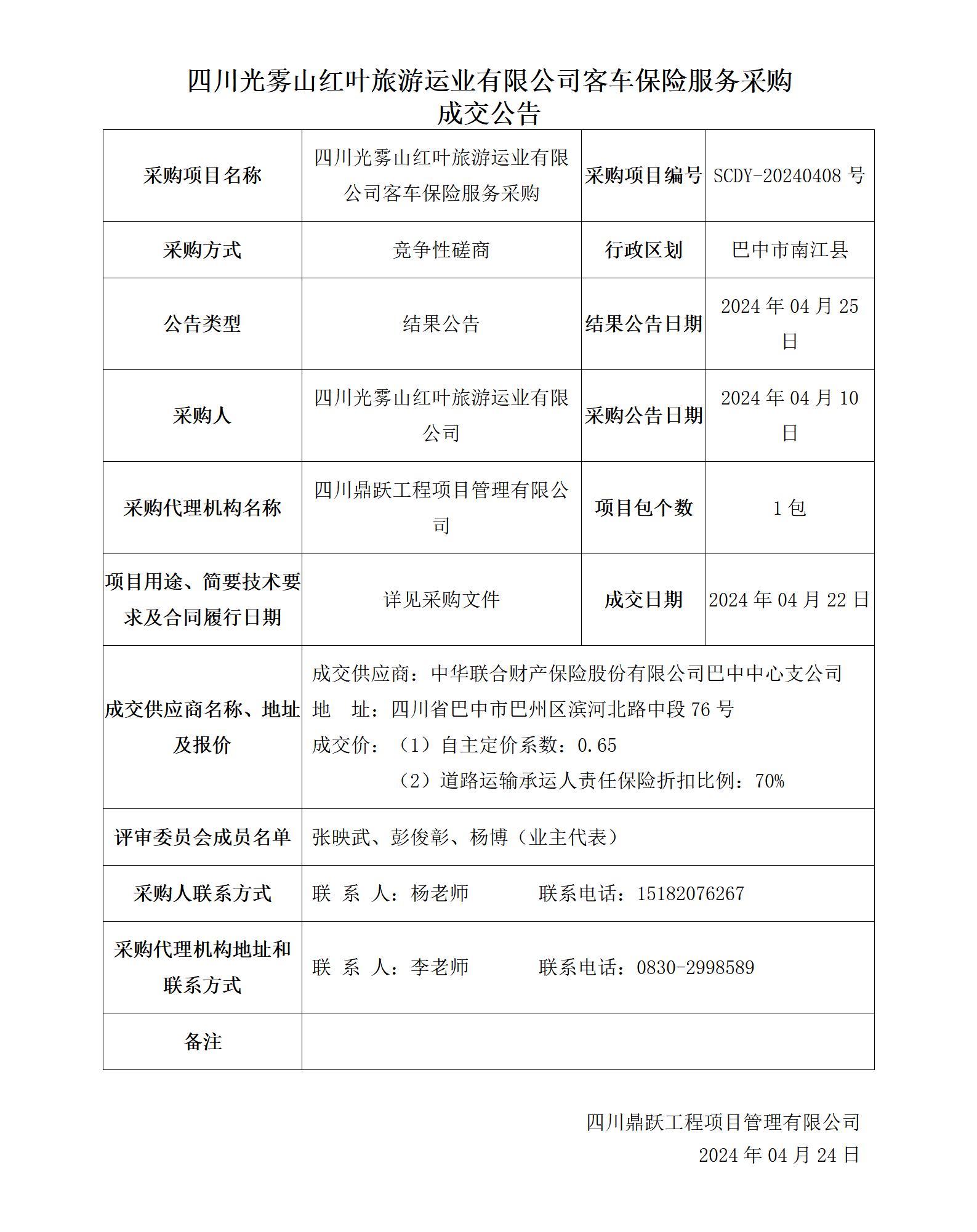 四川光霧山紅葉旅游運(yùn)業(yè)有限公司客車保險(xiǎn)服務(wù)采購(gòu)成交公告