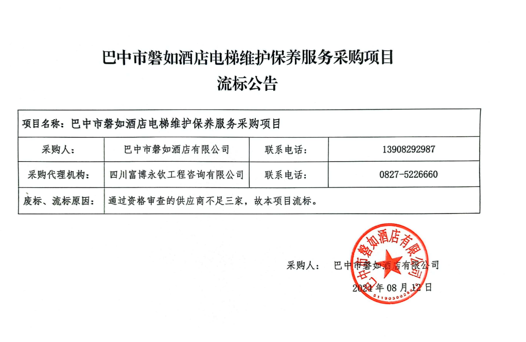 巴中市磐如酒店電梯維護保養(yǎng)服務采購項目流標公告