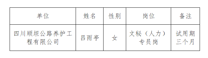 根據(jù)《四川米倉山建設(shè)工程有限公司下屬企業(yè)2024年公開招聘公告》文件精神,經(jīng)過網(wǎng)絡(luò)報(bào)名、資格審查、考試面試、體檢及背調(diào)等程序,現(xiàn)將擬錄用人員及崗位情況予以公示。公示時(shí)間為5個(gè)工作日(2024年12月10日至2024年12月16日止)。公示期間,如有異議,請通過以下方式反映:監(jiān)督(舉報(bào))電話:0827-6115666。